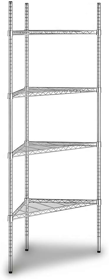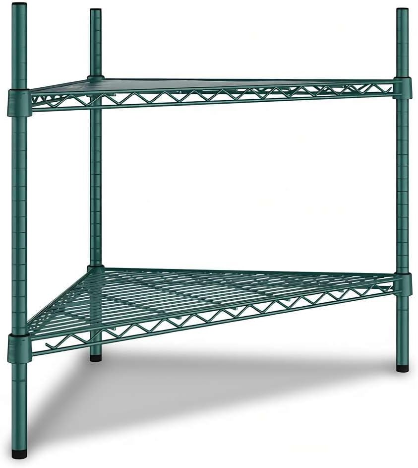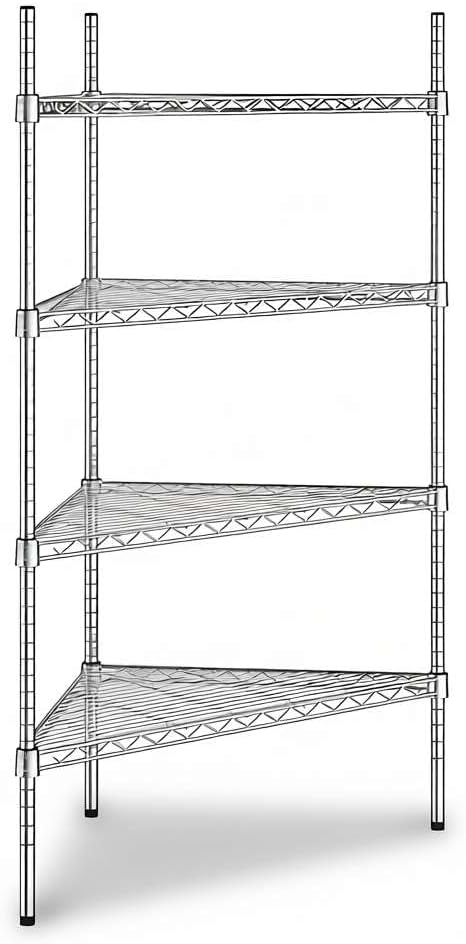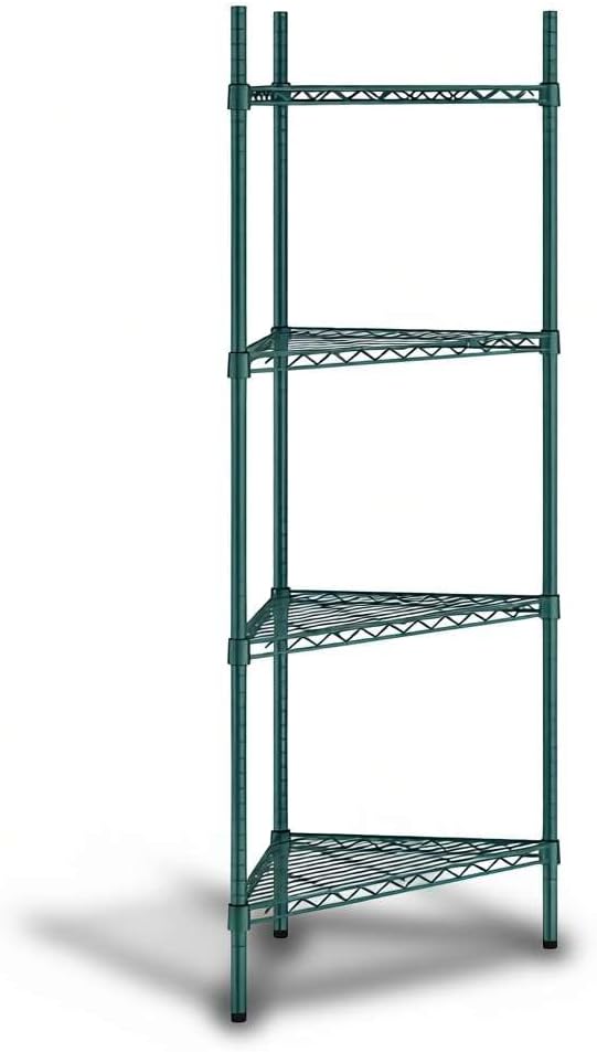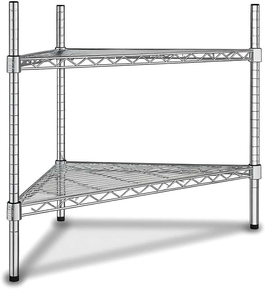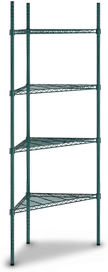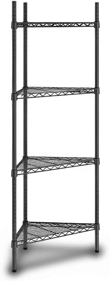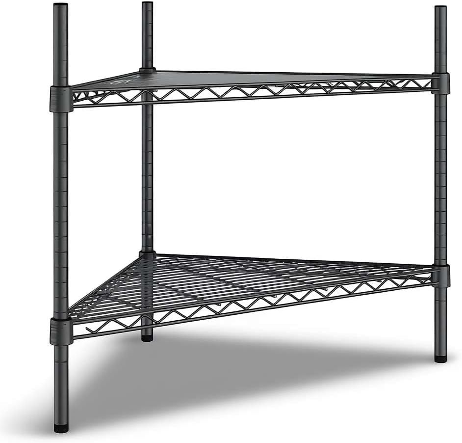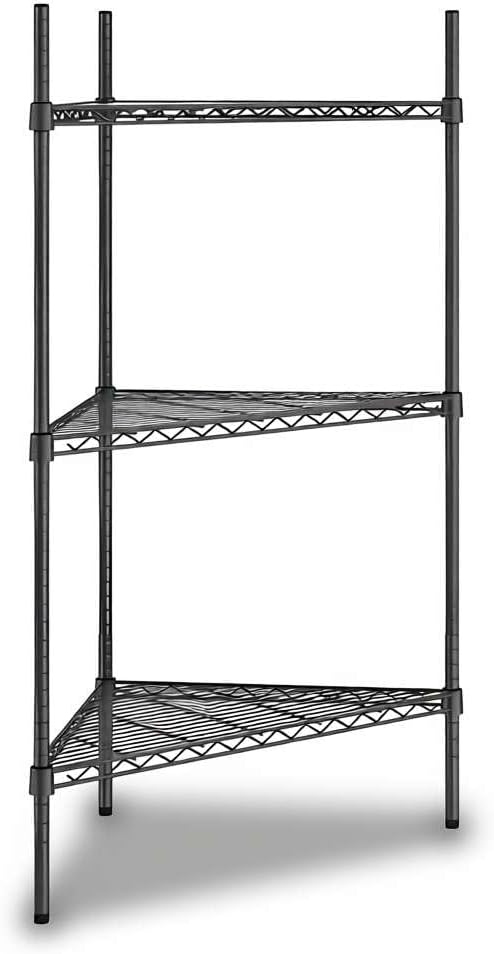 NSF Black Epoxy Triangle Corner Shelving Kit: Optimize your storage space with this NSF Listed black epoxy triangle corner shelving kit, designed to maximize unused corners in commercial and residential environments. Measuring 33" W x 24" D x 34" H, this 3-shelf adjustable wire rack delivers heavy duty storage performance with a clean, professional look. Perfect for restaurants, hotels, cafés, bakeries, bars, warehouses, or home kitchens, pantries, bathrooms, laundry rooms, garages, and workshops.Space-Saving Triangle Design: This shelving unit is engineered to fit neatly into corners, turning unused areas into valuable storage. Ideal for janitorial closets, stock rooms, prep areas, or front-of-house merchandising displays, it allows businesses to expand storage capacity without increasing footprint. In residential spaces, it keeps everyday essentials organized in kitchens, bathrooms, or basements.Heavy Duty Capacity: Built from durable black epoxy-plated steel, each wire shelf holds up to 500 lb., with a total weight capacity of 1,500 lb.. This makes the rack strong enough for storing bulk dry goods, packaged foods, cleaning supplies, cookware, or industrial tools in high-volume commercial kitchens, warehouses, and household storage areas.Adjustable and Versatile: The wire shelves can be repositioned in 1" increments, adapting to evolving inventory or seasonal product displays. Whether used as a retail display shelf, restaurant storage rack, or home organizer, this flexibility ensures long-term usability across different settings.Easy Assembly: The shelving kit includes (3) black wire shelves, (3) 34" posts, and split sleeves for quick setup. Simply snap the sleeves around each post, slide the shelves into place, and enjoy a reliable, space-saving storage solution that is ready in minutes.