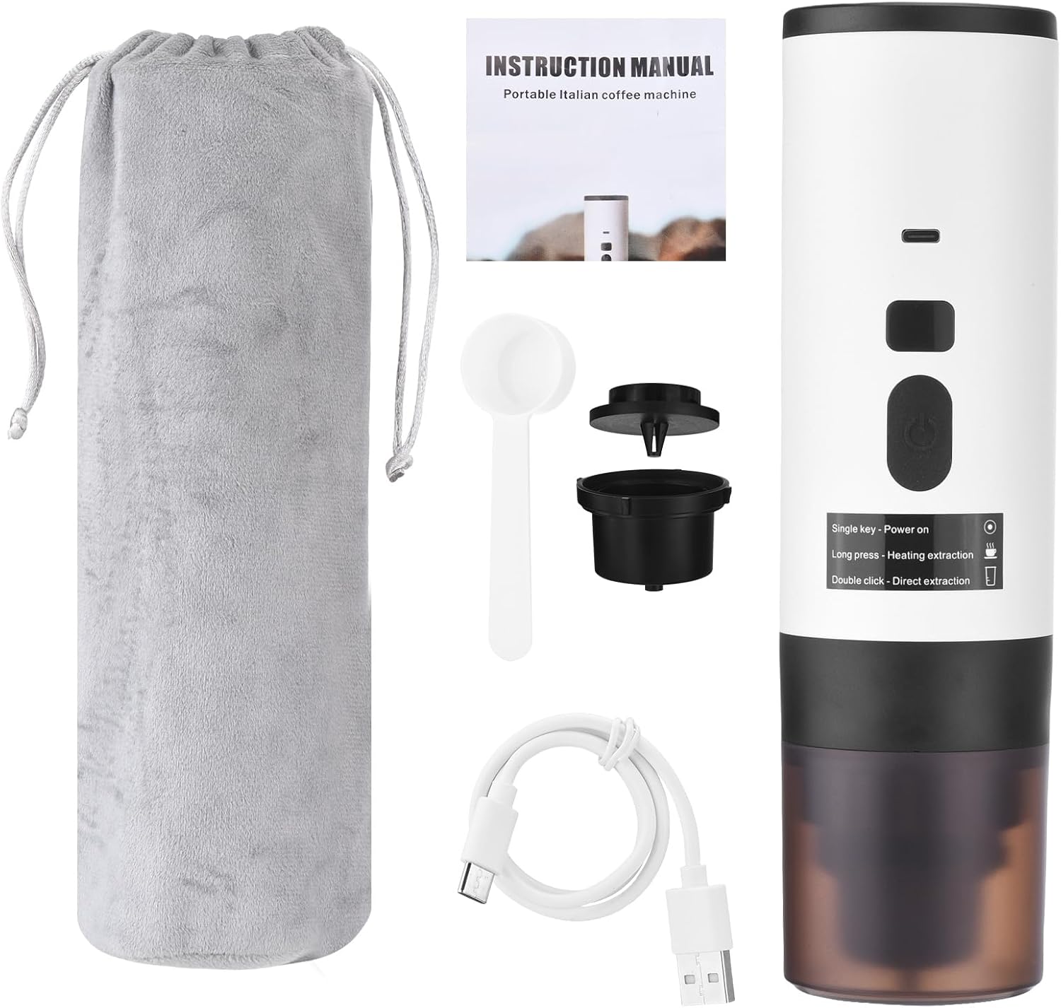 Spec: This versatile portable coffee maker is compatible with ground coffee, large or small capsules, offering multiple brewing options. Engineered for convenience and performance, the sturdy design of our small coffee machine guarantees durability. We downsized the chunky coffee machine to the size of a water bottle. So you can take the coffee shop with you anywhere, anytime. Made for outdoor enthusiasts and coffee addicts. Item Type: Portable Coffee Maker Structure: ABS + Stainless Steel Battery: 3*2600mAh (Built-in) Charging Time: 3-4 hours Single Working Time: 80s Capacity: Water Box: Approx. 90ML/3.04oz, Coffee Cup: Approx. 120ML/4.06oz Item Size: Approx. 24x6.5x6.5cm/9.45x2.56x2.56in Package Size: 27x8x8cm/10.63x3.15x3.15in Gross Weight: Approx. 640g/22.58oz Package List: 1 x Coffee Machine 1 x Charging Cable 1 x Instruction Manual 1 x Measuring Spoon 1 x Velvet Bag 2 x Accessories Note: 1. Capsule compatibility: Please ensure that the coffee capsules are compatible with the machine model to bypass blockages or damage due to incompatibility. 2. Power adapter: Check if the voltage is compatible (especially when traveling abroad). Some support car chargers or power from mobile power banks. Please confirm before. 3. Correct insertion of capsules: Ensure that the capsules are placed correctly according to the instructions and position, avoiding tilting or misalignment. Some may require puncturing the capsule. Be careful not to apply too much strength during the process to stop powder leakage. 4. Water control: Adjust the water volume based on the capsule type to stop over-extraction or low coffee concentration. Do not exceed the maximum water level in the water box to stop overflow. 5. Temperature management: Wait for the machine to preheat (indicator light on) before use. When making multiple cups continuously, allow 1 to 2 minutes interval to stop