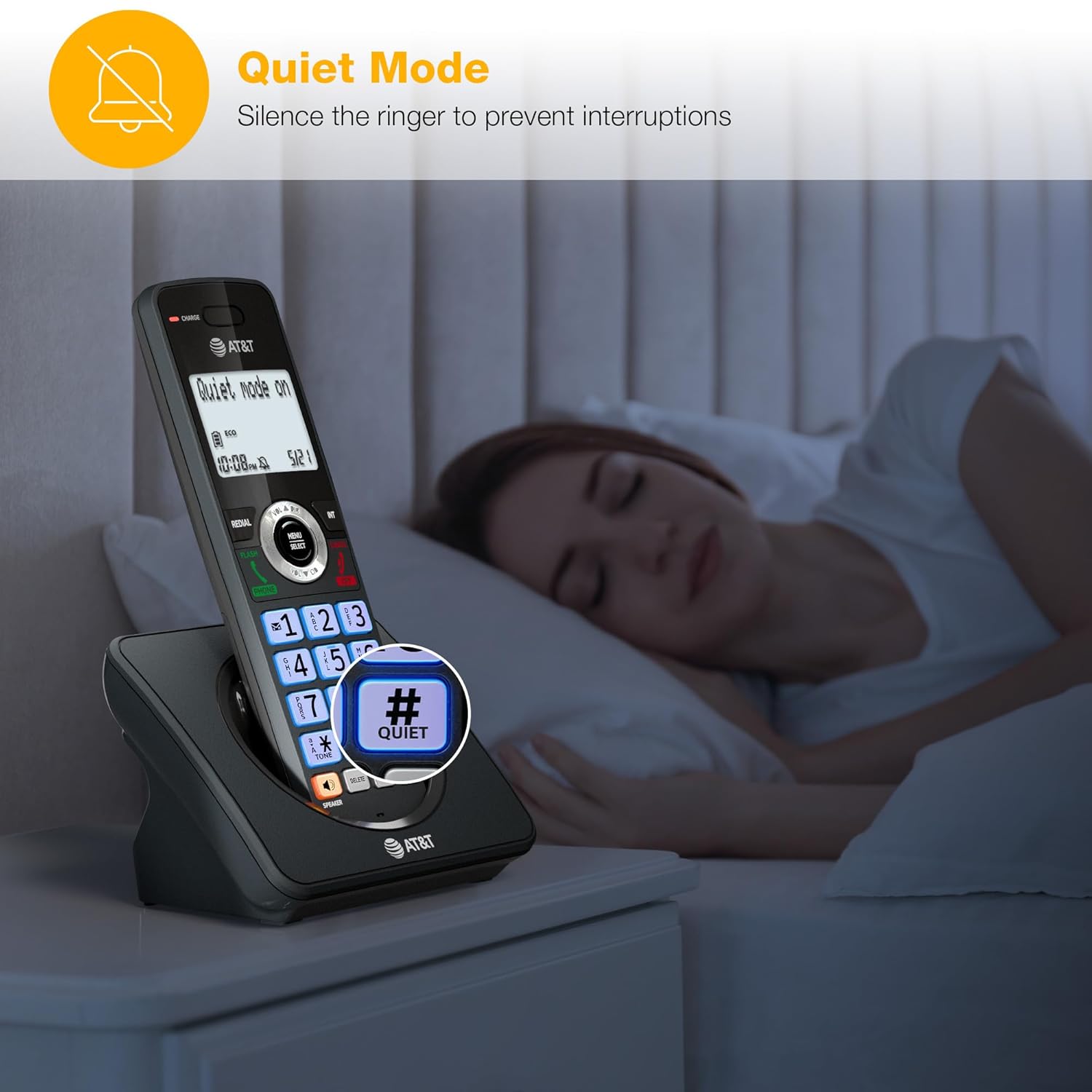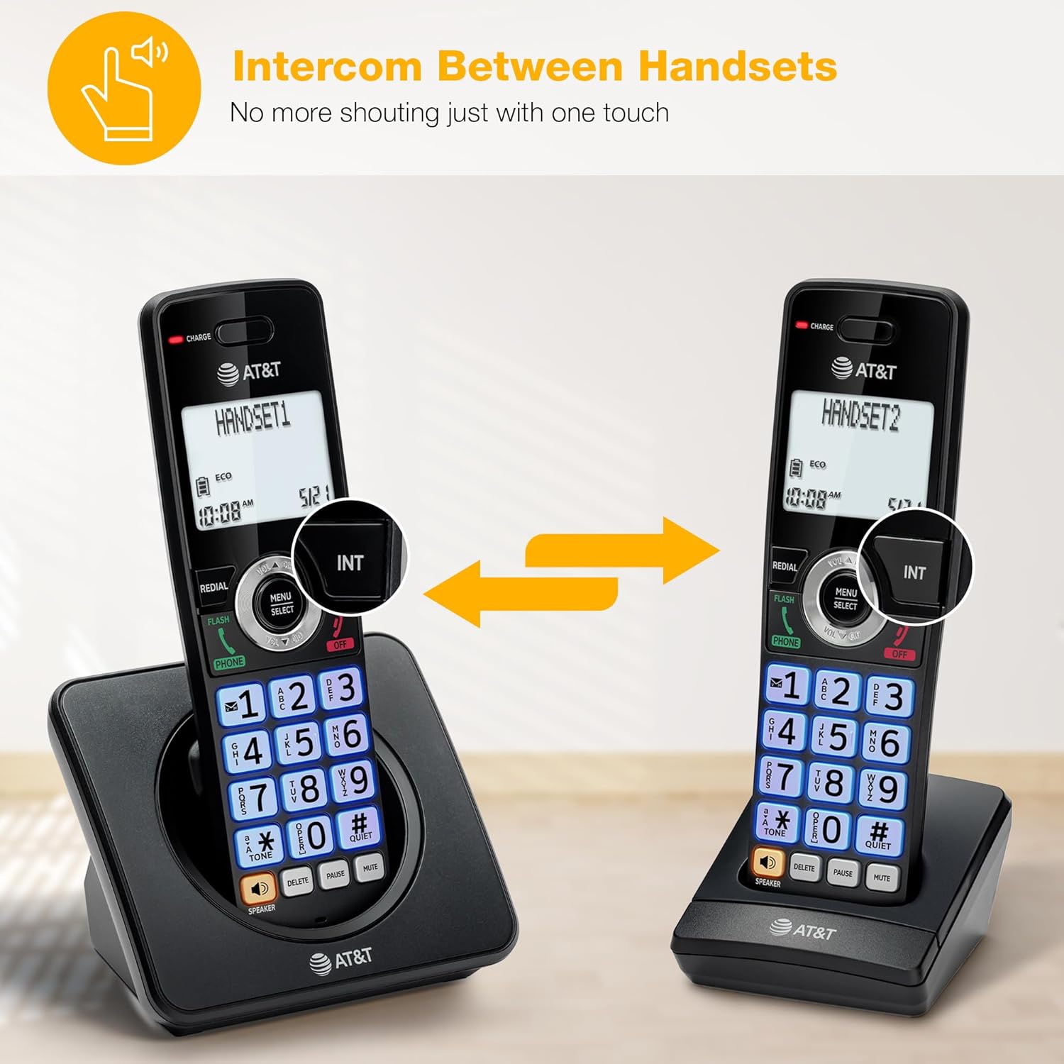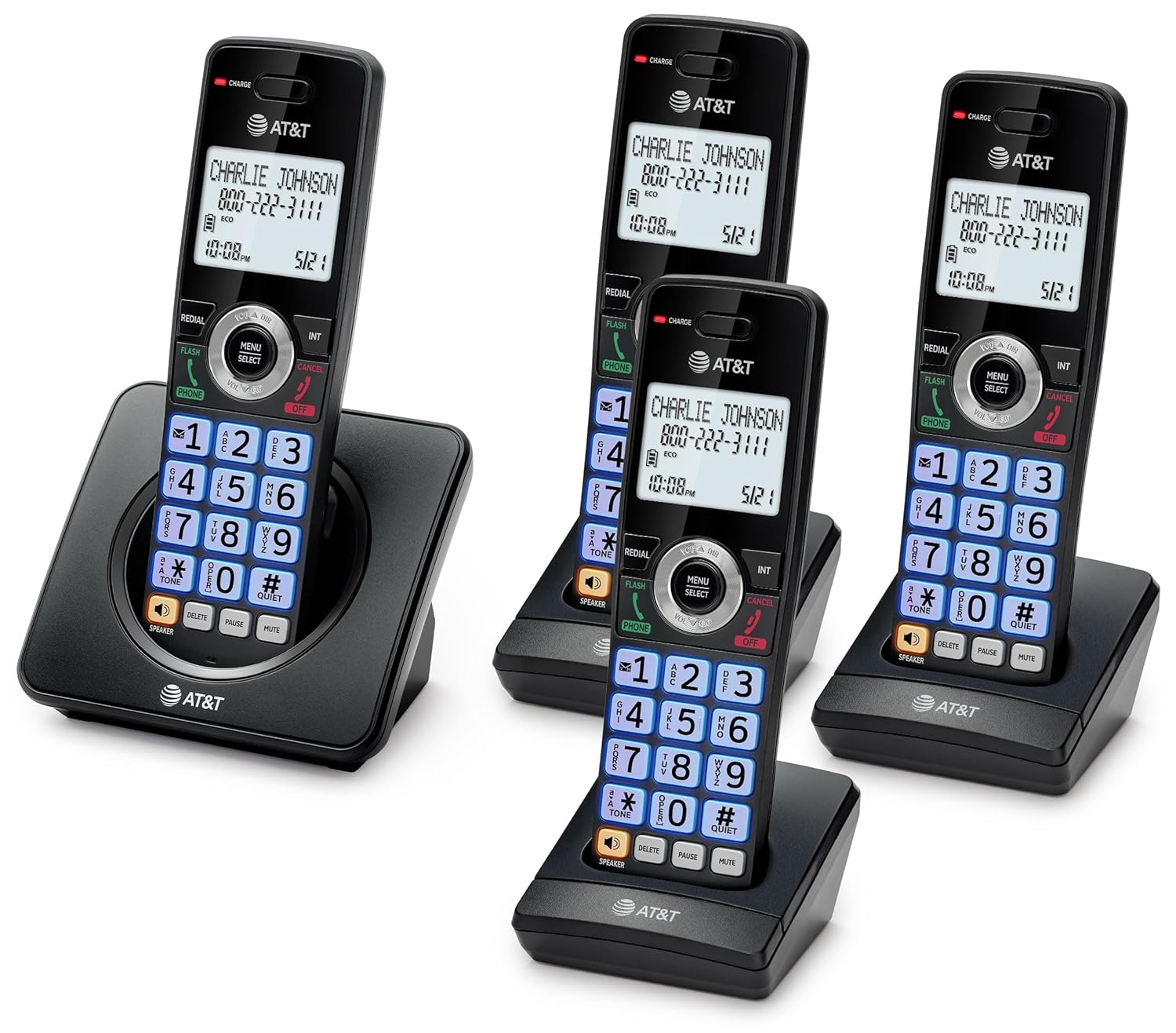 The AT&T GL2101-41 4-Handsets DECT 6.0 Cordless Phone with Call Blocker and Caller ID/Call Waiting lets you block unwanted calls while showing you who’s calling. Talk and listen at the same time with natural, two-way conversations on both the handset and base with full-duplex handset speakerphones. The 2-inch white display features high-contrast text, making it easy to read caller ID and call history. The orange backlit keypad on the handset helps you dial numbers evenly, eving in low-light conditions. Stay connected longer. Enjoy up to 10 hours of talk time or up to 5 days of standby on a single charge, so your phone is always ready. ECO mode manages power consumption so the system uses less energy and you get the best battery life. Expand your phone system by adding up to 5 handsets using the GL210-0 accessory handset (sold separately), all with just one phone jack. Perfect for households that need flexible, room-to-room communication and a setup that fits your lifestyle.