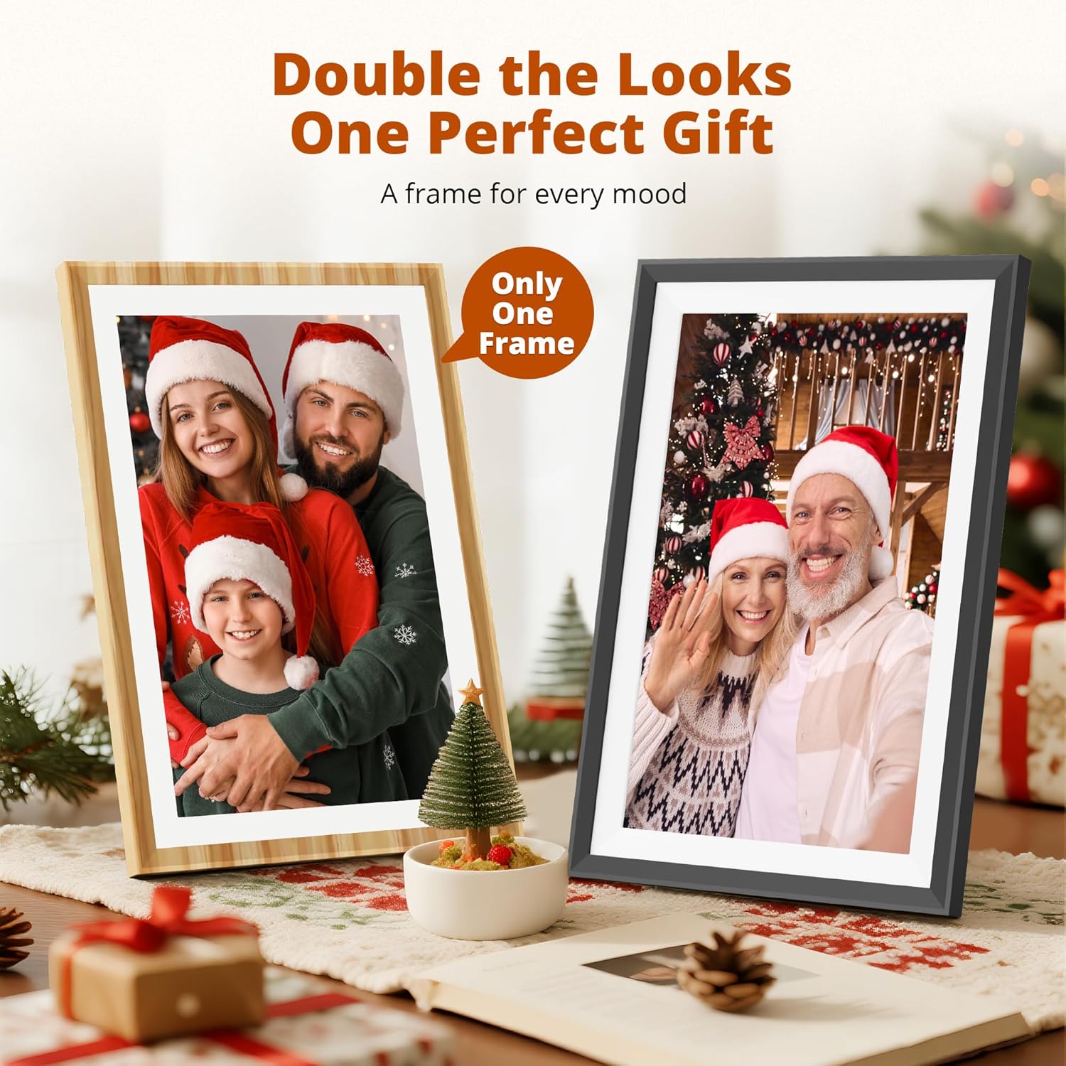 • SWITCHABLE FRAME DESIGN: Comes with two interchangeable frames in different colors to match your home style. Effortlessly switch between frames for a fresh look that fits any season, décor, or mood — one device, multiple styles.