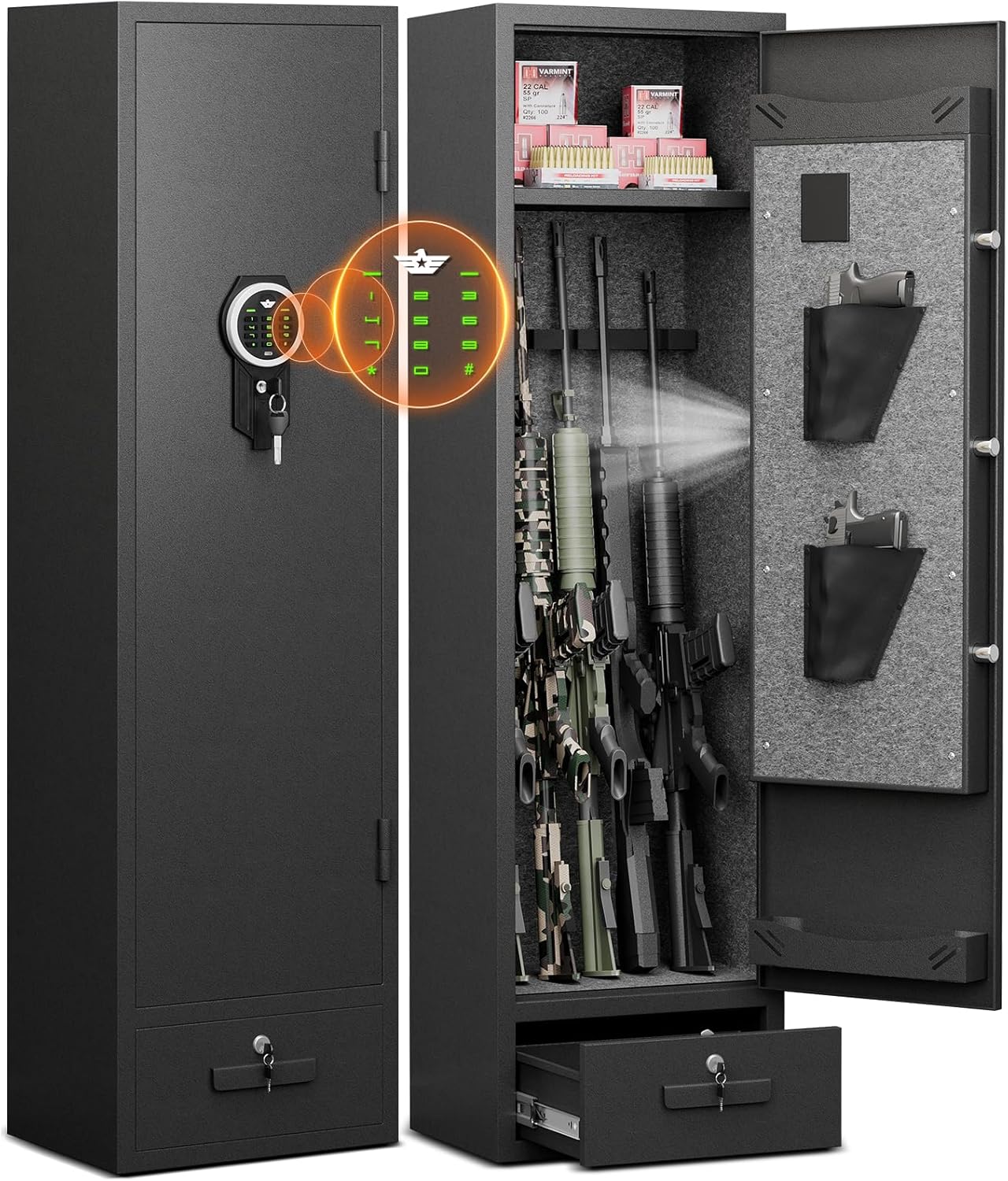 | Included Components | 1 x Rifle Gun Safe, 2 x Emergency Keys, 2 x Drawer Keys, 5 x Expansion Screws, 1 x Type-c Cable, 1 x Gun Rack, 1 x Instruction Manual |