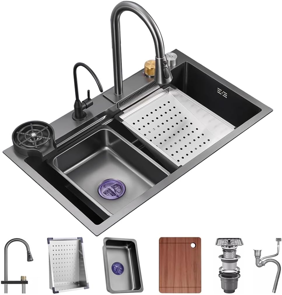 😊【SINK ADVANTAGES】① Waterfall water outlet mode, large area water outlet, fast cleaning, waterfall water flow width up to 210mm, convenient for flushing and water-saving,② The pull-out faucet allows for smooth expansion and contraction. The faucet can extend a length of 350mm, and the faucet rod can rotate 360 °. The internal gravity ball automatically returns to its original position. The gravity ball is installed on the pull-out pipe, making it more flexible to use the faucet③ There are three types of water outlet modes for faucets, namely water column outlet, mesh outlet, and high water pressure outlet.④ The LED water temperature display screen will display the degree Celsius of the water temperature and the time of water discharge. It is internally driven by water flow and does not require charging.⑤ The rotary tabletop control knob controls the drainage design, eliminating the need to manually open the drain to drain water. Turning the knob allows for drainage. Rotate left to store water and right to drain water.⑥ The left corner drainage port is slightly tilted for smoother drainage, increasing the utilization rate of bottom cabinet space by 90%. The diameter of the drainage outlet is 90mm. Standard drainage outlets are suitable for most garbage disposal installations.⑦ The sink adopts a narrow edge design, which is more space saving and can be installed in multiple ways. Adopting Top Mount, Flush Mount, or Under Mount (semi embedded)⑧ Anti spill hole events water overflow, securing a mass free experience😊【SINK SPECIFICATIONS】✔ Material: High quality stainless steel with a durable coating✔ Color: Black Grey✔ Sink depth: 21cm/8.2 inch✔ Product Dimensions: 68×45×21cm/26.7×17.7×8.2 in75×45×21cm/29.5×17.7×8.2 in80×45×21cm/31.4×17.7×8.2 in✔ Installation type: Top Mount, Flush Mount, or Under Mount (semi embedded)❤️【PACKAGE INCLUDES】