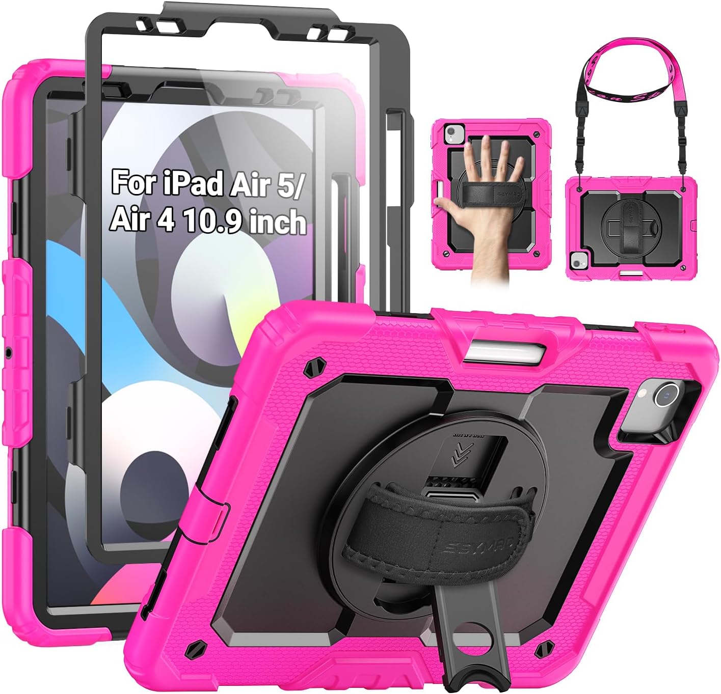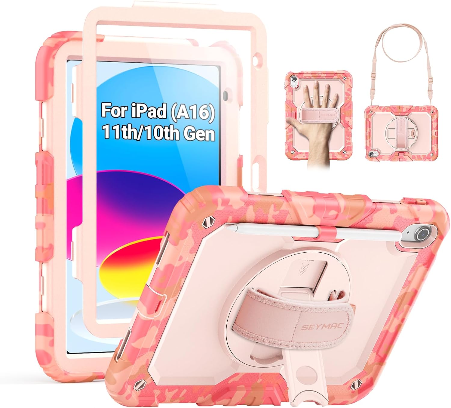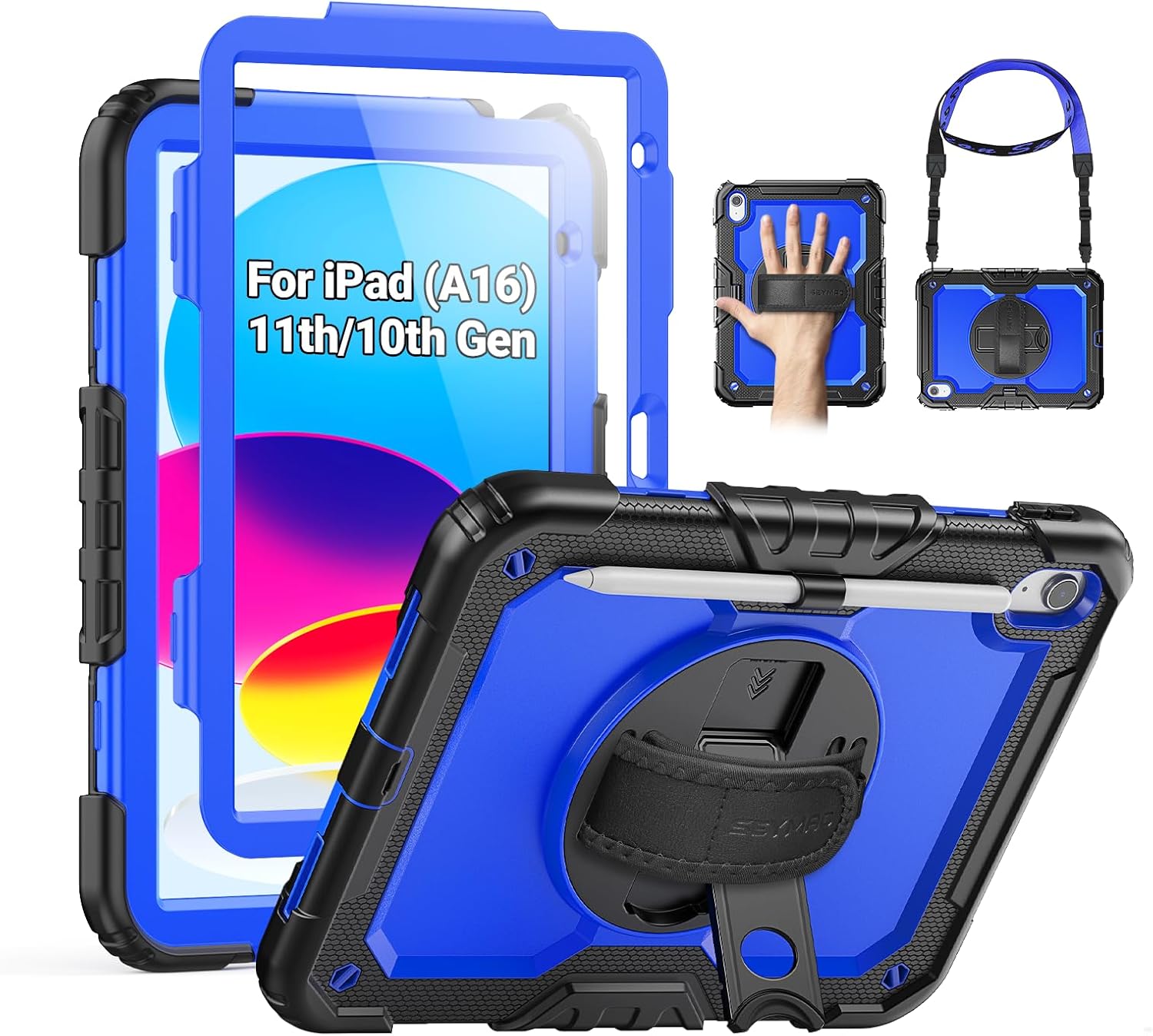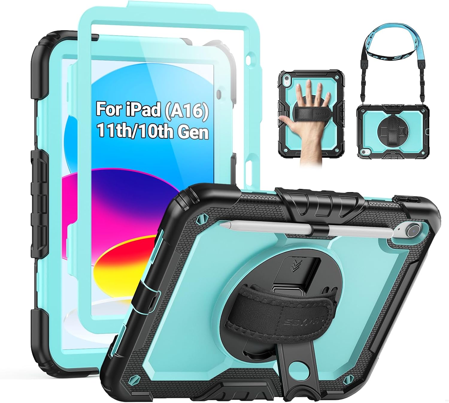 SEYMAC Case for iPad (A16) 11th/10th Generation 2025/2022 (11″/10.9″), Sturdy Heavy Duty Full-Body Shockproof Protective Case with Screen Protector, Rotating Stand, Hand/Shoulder Strap, Black