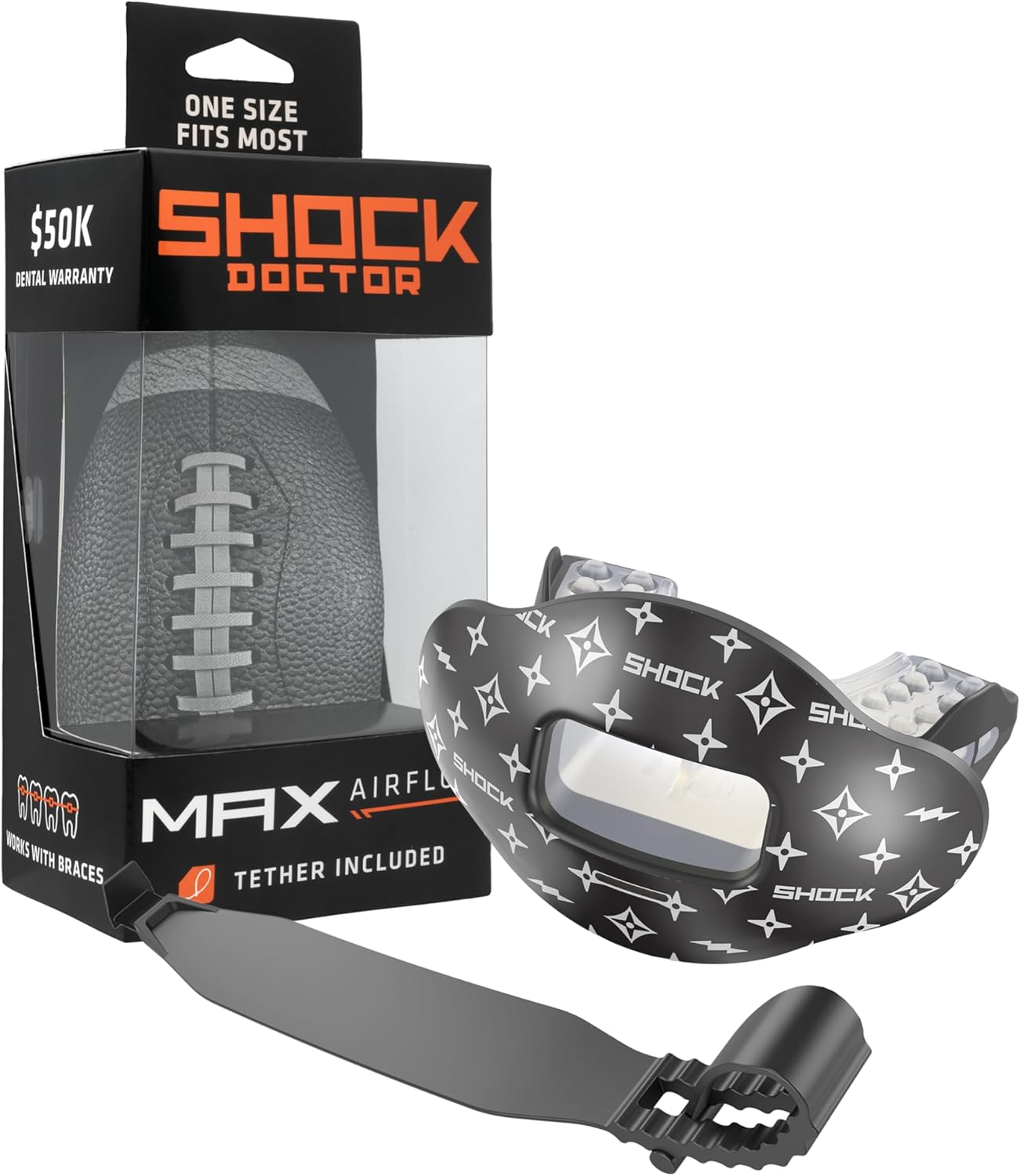 The Shock Doctor Max Airflow 2.0 Lip Guard is a mouthguard for football designed specifically for players of all ages, from youth to adults. This football mouth guard, suitable for youth and adult athletes, offers protection with a reinforced outer frame and high-impact technology. The wide opening mouthpiece and helmet strap provide convenience and enhanced breathability, with a large breathing channel offering 10% more air flow capacity compared to other lip guards. Our football mouthguard for braces is perfect for those requiring added dental safety, as it works seamlessly with braces. The flexible Shock Doctor polymers and integral bite pads deliver maximum comfort, making it an ideal shock doctor mouthguard for braces. Breath easy and stay protected with our mouthguard football products that are both LATEX FREE and BPA FREE. The football mouth guard adult and youth versions are built to meet national and state regulations. Express your personal style with various graphics, chrome options, and colors available—perfect for kids, teenagers, and adults alike. Whether you're on the field for football, hockey, or lacrosse, the Shock Doctor mouth pieces football collection stands out for quality and durability. Experience unmatched breathability with the Max Airflow, the Oxygen King of football mouthguards. The updated design prevents teeth from blocking the breathing channel and maximizes air intake for longer, wind-free performance. Plus, our mouthpiece football products come with a $10,000 dental warranty, demonstrating Shock Doctor's commitment to your dental health and protection. Choose Shock Doctor for your mouth pieces football youth and adult needs. Take a deep breath, stay protected, and dominate in every game with our top-tier football mouthguard for braces and non-brace users alike.