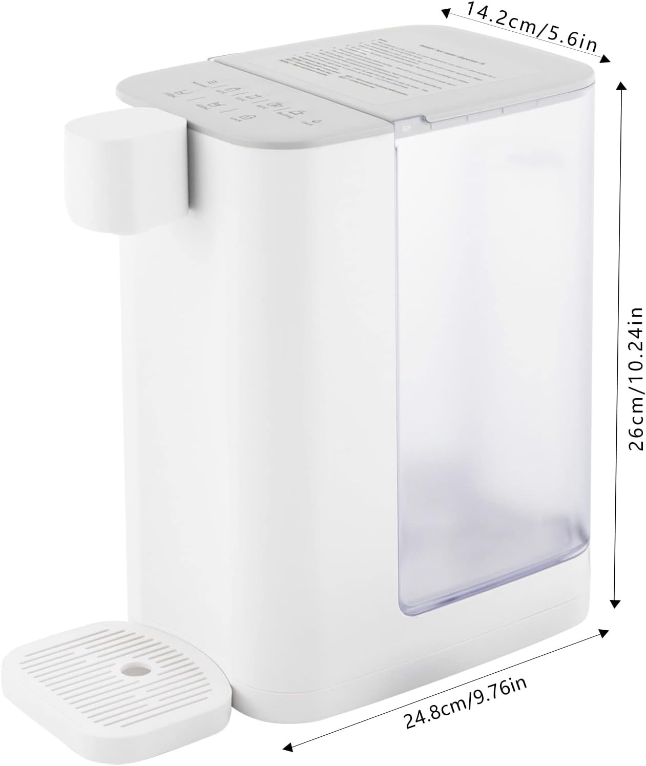 Product Description: This small white instant hot water dispenser is very convenient and suitable for home or office use. It can heat water quickly, so you can drink hot water at any time and improve your quality of life. Whether it is making tea, coffee, or hot milk, you can easily get satisfactory results from this machine, providing comfort and convenience. Details Two Water Levels: It has 160ml and 260ml two levels of water, the scientific water design to meet your drinking needs. By the way, you just have to press the quantitative button to stop the water from coming out. Luminous Light: It is paired with a luminous light that illuminates you at night, making it easy for you to get water at night. High Outlet Design: Its high outlet design can meet a variety of heights of the cup, so you no longer worry about the cup being too high to take water. Application It is suitable for various occasions, including homes, offices, schools, and other places where drinking water is needed. Specification Material: Plastic, HIPS, Silicone and PP Color: White Plug: US Standard Voltage Frequency: 110V-60HZ Rated Power: 1600W Water Output Speed: 1000ml / min / 0.26GPM Water Volume: 160ml/5.14oz, 260ml/8.79oz Water Tank Capacity: 3L/102oz Temperature Adjustment: Room Temperature, 45℃/113°F, 55℃/131°F, 85℃/185°F and 100℃/212°F Noise: 45db Product Size: 24.8*14.2*26cm/9.76*5.6*10.24in Package Size: 30*19*32cm/11.8*4.78*12.6in Net Weight: 1.6kg/3.53 lbs Gross Weight: 1.99kg/4.39 lbs Package Included 1* Instant Hot Water Dispenser 1* English Manual