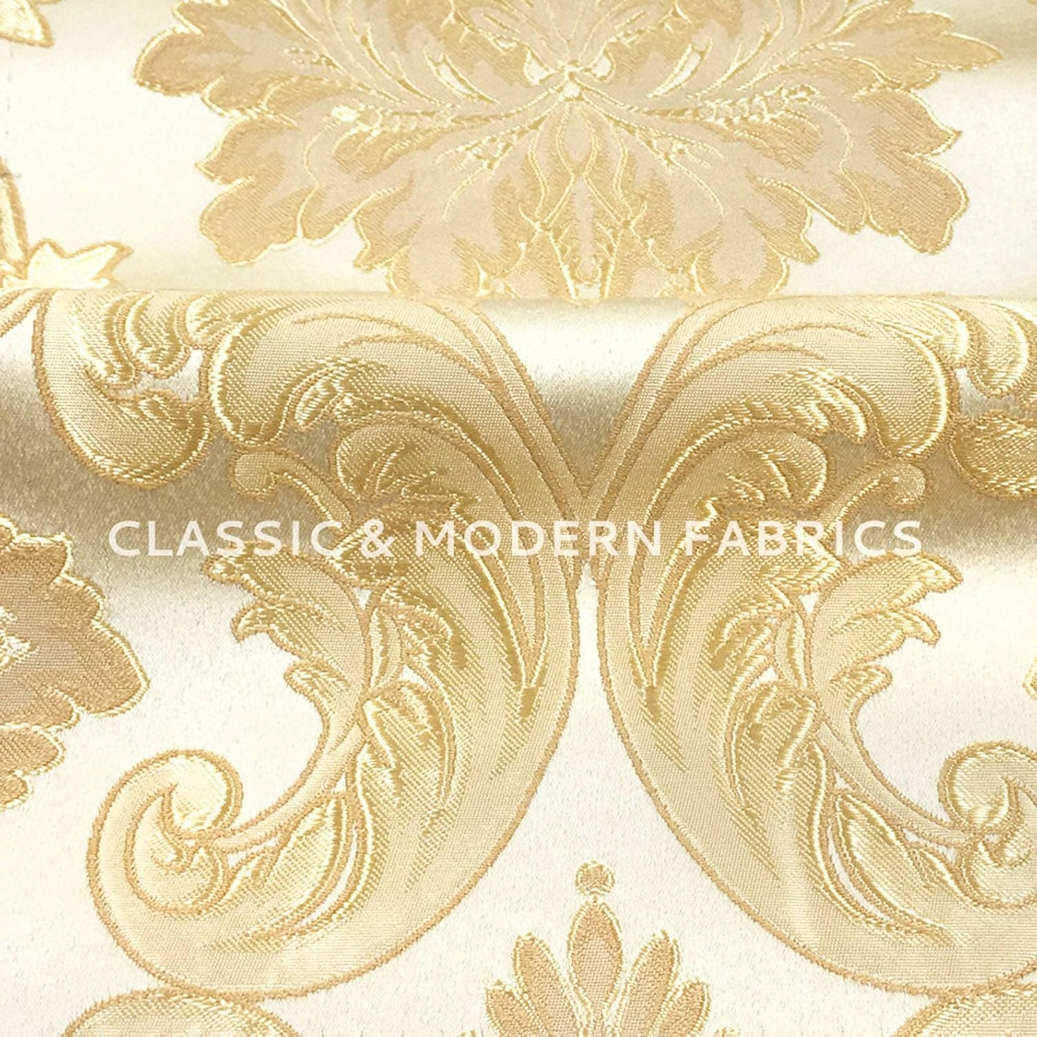 4 COLORS 110 inch Wide Royal Floral Damask Jacquard Fabric Width - 110 inch 75 Percent Polyester 25 Percent Viscose Repeat - V15.1 inch H 13.8 inch Use - Drapery, Upholstery, Home Decor, Garment Care - Dry Clean Choose a color from 3 colors: A) WHITE B) IVORY GOLD C) CHAMPAGNE GOLD D) BLUE GOLD ORDER PROCESS: Sold by the yard. No exchanges or returns. PACKING YOUR ORDER: CUT ORDER We cut and fold your fabric into a small package, much like you would a blanket.