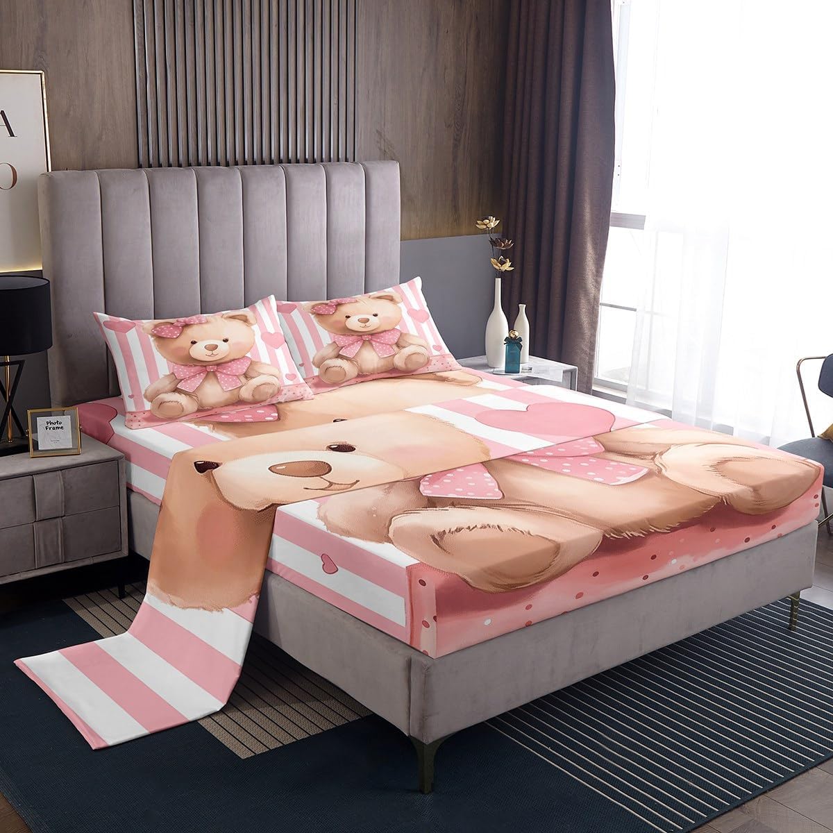 Cartoon Fox Fitted Sheet Set Full Size 4 Pcs,Cute Animal Teens Sheets,Pink Bowknot Geometric Stripes Bedding Sets (1 Fitted,1 Flat,2 Pillowcases) Luxury Deep Pocket Bed Sheets